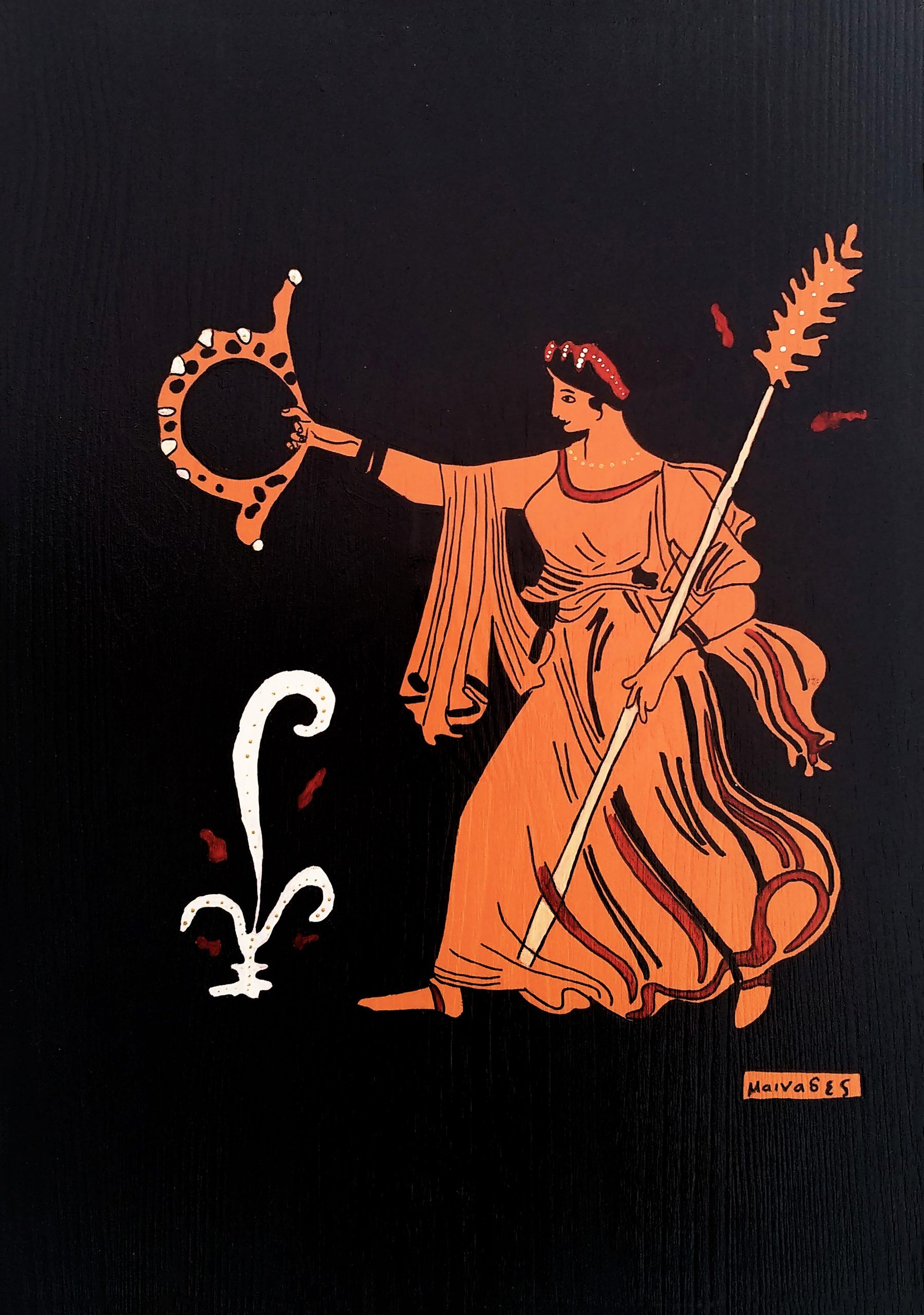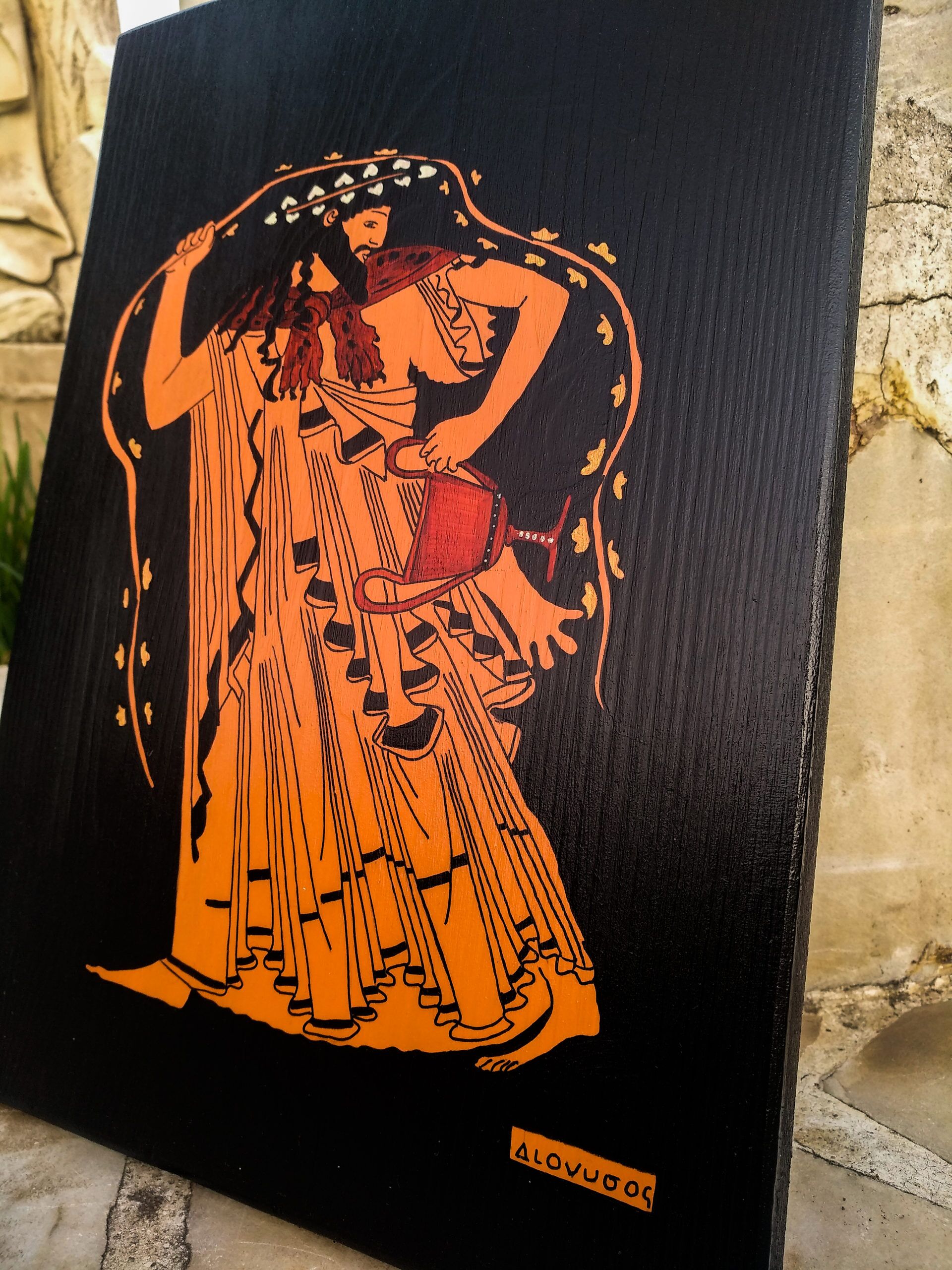 “Bağ ve şarap tanrısı Dionysos, aynı zamanda insanların mistik dünyasının temsilcisi, tiyatrocuların tanrısıdır. Diğerleri gibi aristokrat ve soylu değil direkt halk içinden desteklenen bir tanrıdır. Satyr ve Menad adı verilen müritlerinin de olduğu büyük şenlik alayları içinde, başında asma yaprakları ve elinde Kantharosu ile özgürleşen ruhu, baskı ve kontrole başkaldırır ve dünyayı dolaşmaya başlar.