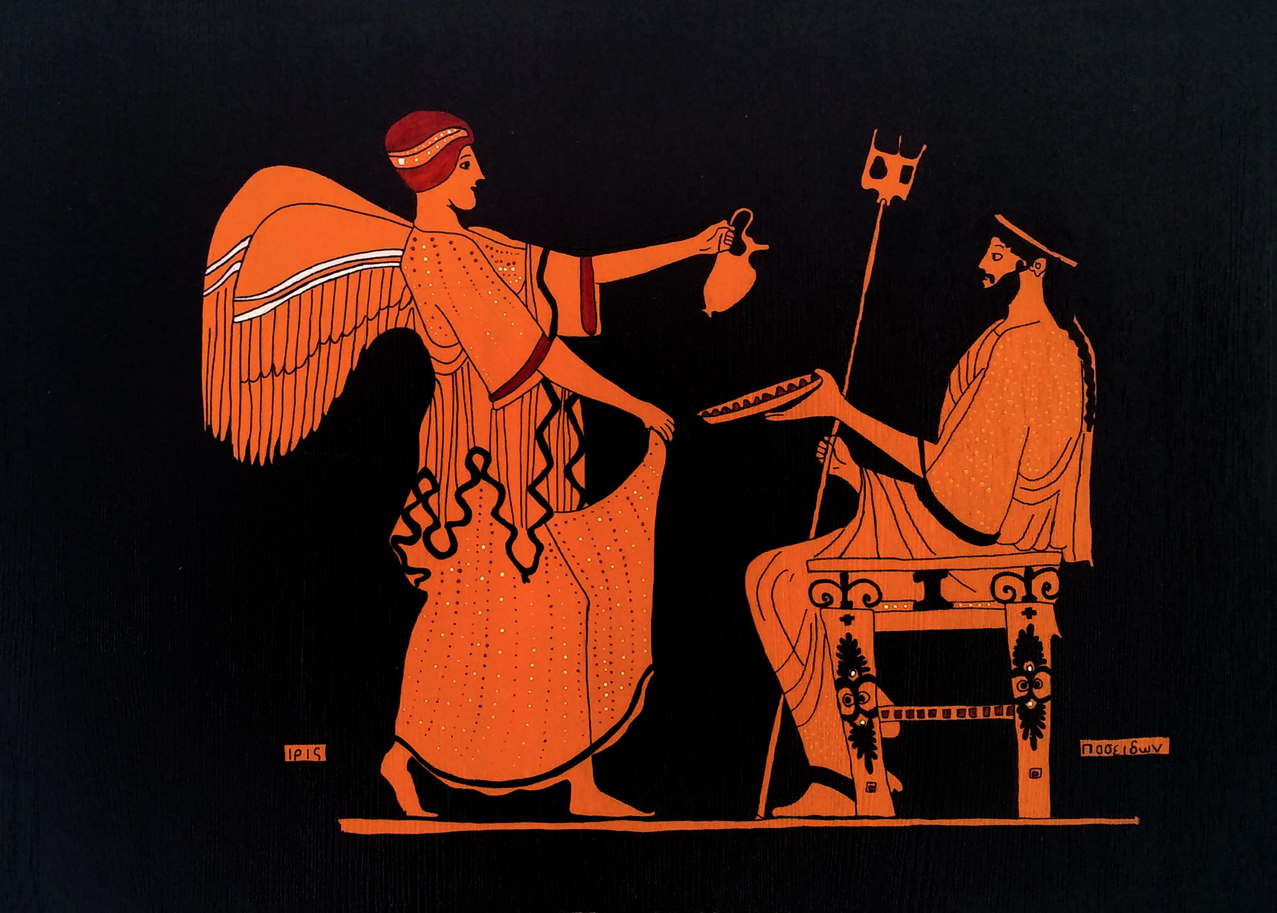 Iris ise gök kuşağını simgeler. Gökkuşağı denizden çıkarak gökle yer arasındaki ilişkiyi kurar göründüğü için Olympos tanrıları Iris’i ulak ve özellikle insanlara haber salmak için kullanırlar.”